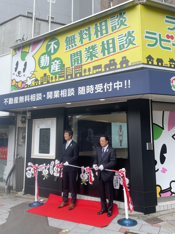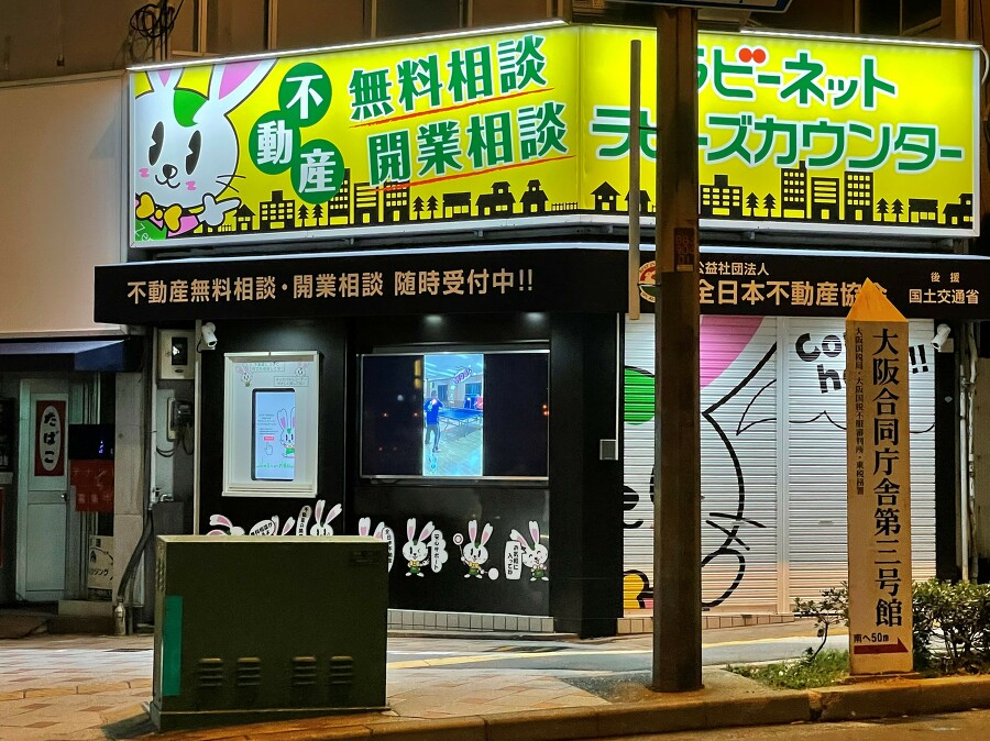 まず、一般消費者と協会を繋ぐ役割です。天満橋サテライトオフィスは基本、無人店舗となっています。店頭、店内2つの大型モニターには全日本不動産協会の事業活動を紹介する動画が常に流れており、一般消費者の方が立ち寄りやすい立地を活かし、協会のPRを積極的に推進しています。